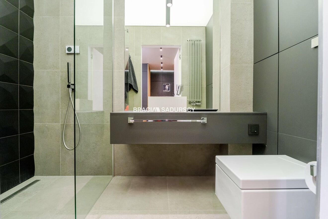 Łazienka - prysznic typu walk-in z deszczownicą, toaleta podtynkowa, zabudowa meblowa, podwieszany sufit z oświetleniem LED.