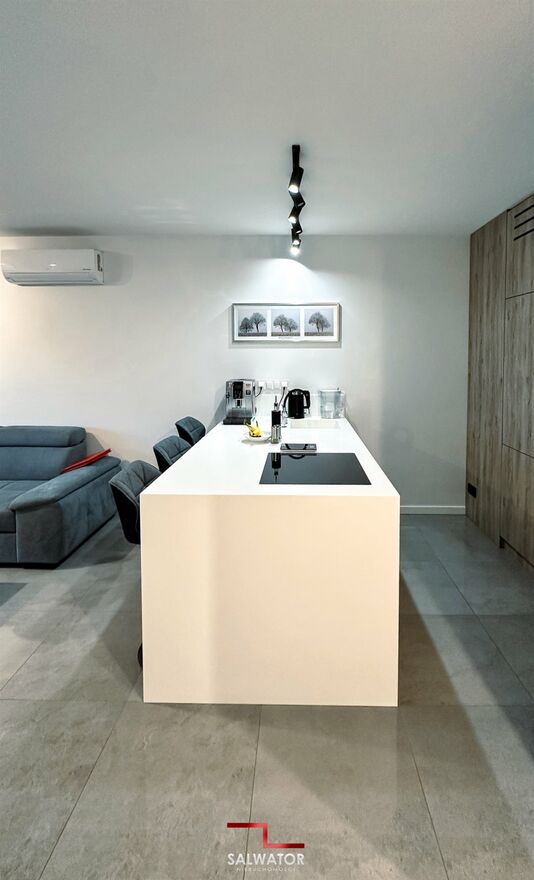 Blat kuchenny i listwy przyścienne w mieszkaniu wykonane z Corianu mineralno-akrylowego, dzięki czemu elementy są idealnie spasowane bez żadnych fug.