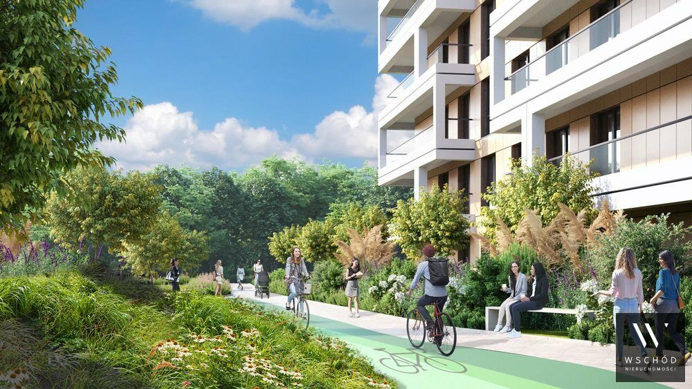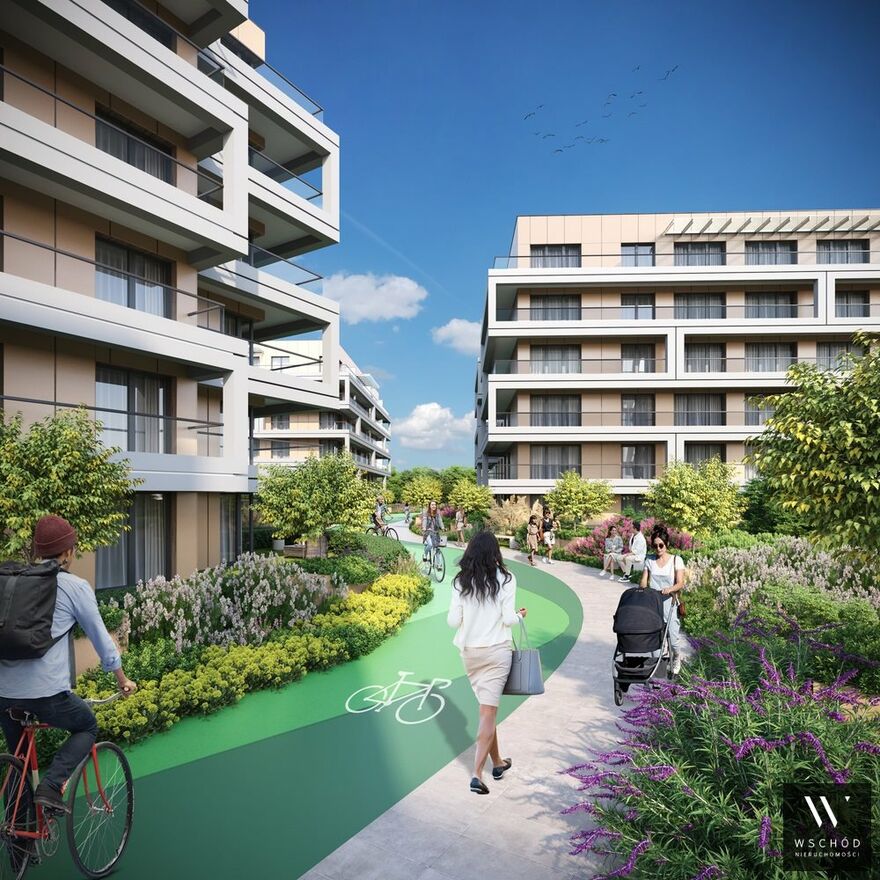 Przestrzeń wspólna: ciągi pieszo-rowerowe, plac zabaw, pergole, tężnia solankowa oraz liczne nasadzenia drzew i krzewów,