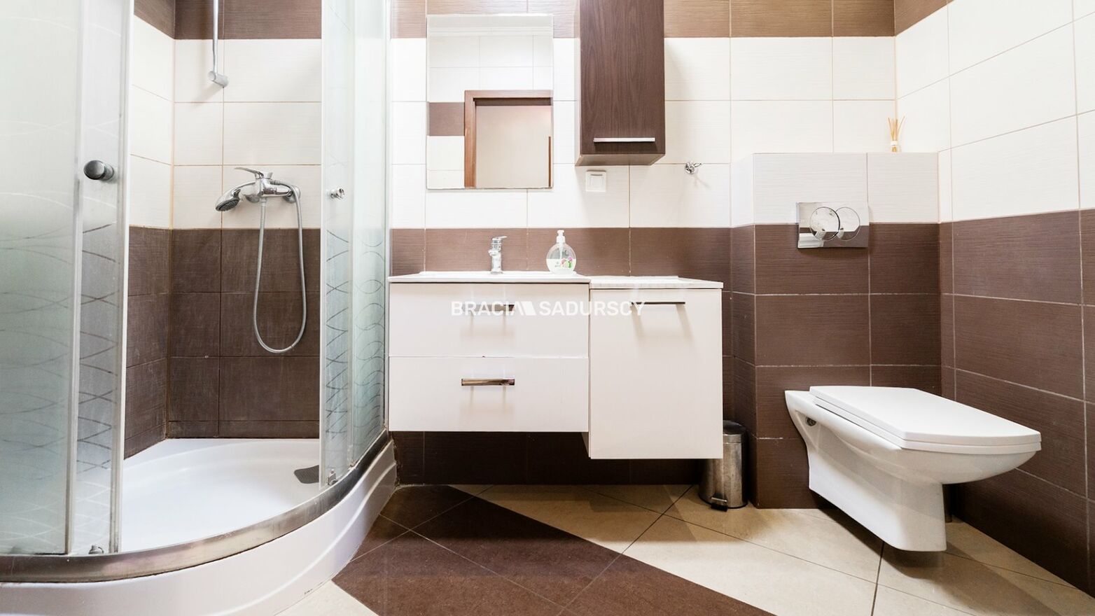 Wyposażenie łazienki: WC, umywalka, lustro, kabina prysznicowa |