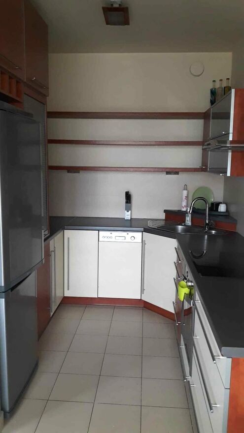 Kuchnia z pełnym wyposażeniem (lodówka, zmywarka, piekarnik, palnik elektryczny) częściowo połączona z salonem.