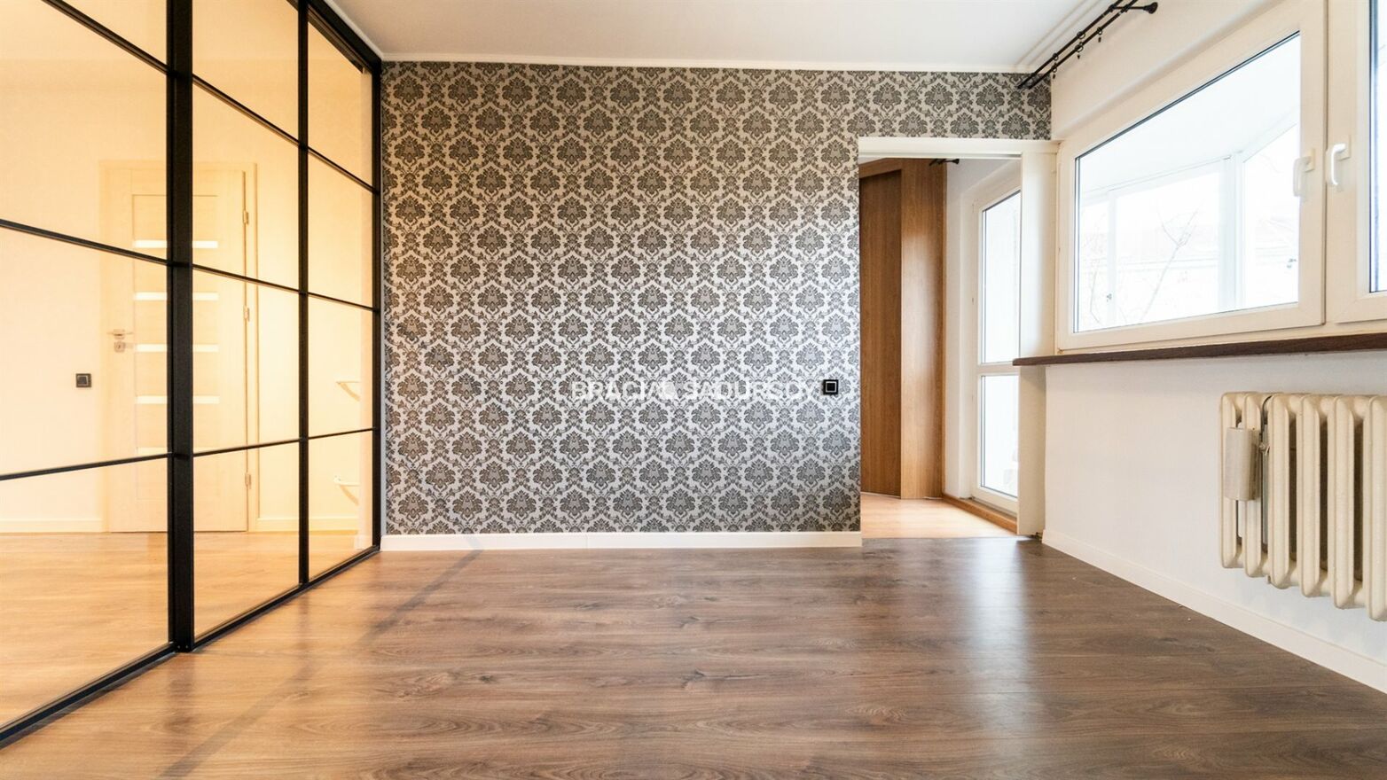 - Dwa przejściowe pokoje o powierzchniach 11,5 i 8 m2, które powstały w wyniku podziału salonu ścianką działową . Dla wygody użytkowników pomiędzy pokojami zamontowano przesuwne drzwi. Z jednego z pokoi jest wyjście na obszerną 6 m2 loggię, zabudowaną przesuwnymi dwuszybowymi oknami. Ekspozycja okien na wschód z widokiem na duży zalesiony skwer.