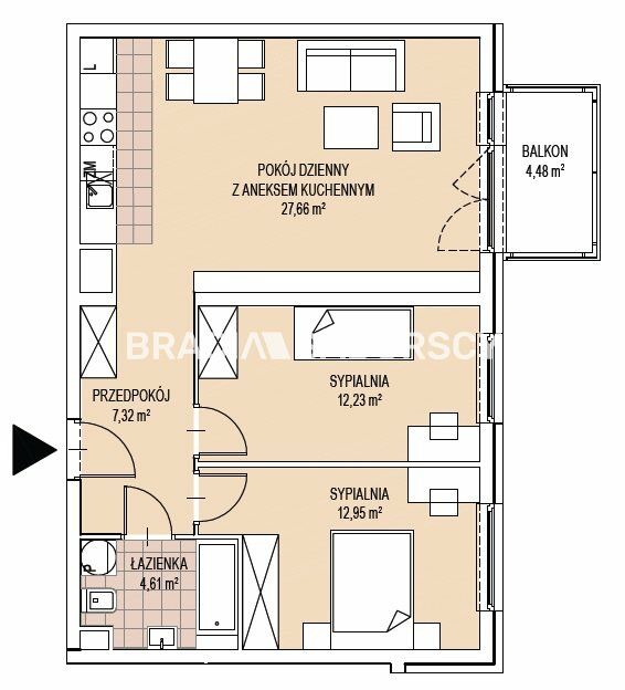 - pokój dzienny połączony z aneksem kuchennym (27,66 m2) oraz wyjściem na balkon,