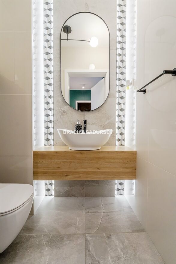 W przedpokoju znalazło się miejsce na szafkę na buty, szafę oraz duże praktyczne lustro. Kuchnia jest w pełni wyposażona, a zastosowane rozwiązania uprzyjemniają korzystanie z niej i ułatwiają zachowanie porządku na co dzień. Szafka na blaszki do pieczenia/ deski do krojenia, dodatkowy blat czy ukryte miejsce na ekspres do kawy to jedne z zastosowanych trików. W razie potrzeby można wygospodarować miejsce na większy stół jadalniany. Powierzchnia salonu pozwoliła na ulokowanie wspaniałej kanapy narożnej, a praktyczna półka za nią dodaje możliwości przechowywania. W ścianach rozprowadzona jest instalacja do systemu dźwięku przestrzennego. Mamy tutaj również balkon z widokiem na podwórko. W salonie zastosowano oświetlenie nastrojowe oraz punkty świetlne. Sypialnia mieści garderobę, przechowywanie oraz duże łóżko. Zastosowanie zaciemniających rolet ogranicza promienie słoneczne oraz nagrzewanie pomieszczeń, znajdziemy tu również wejście na drugi balkon. Trzeci pokój idealnie sprawdzi się jako pokój dziecięcy, czego dowodem są zdjęcia w ofercie. Drewniana zabudowa nie wchodzi w skład oferty. Atrakcyjna łazienka z WC i kabiną prysznicową, umywalką z lustrami, szafką oraz pralko-suszarką i zabudową z miejscem na przechowywanie, dodatkowe WC z umywalką i dodatkową szafką uprzyjemni życie w tym miejscu.