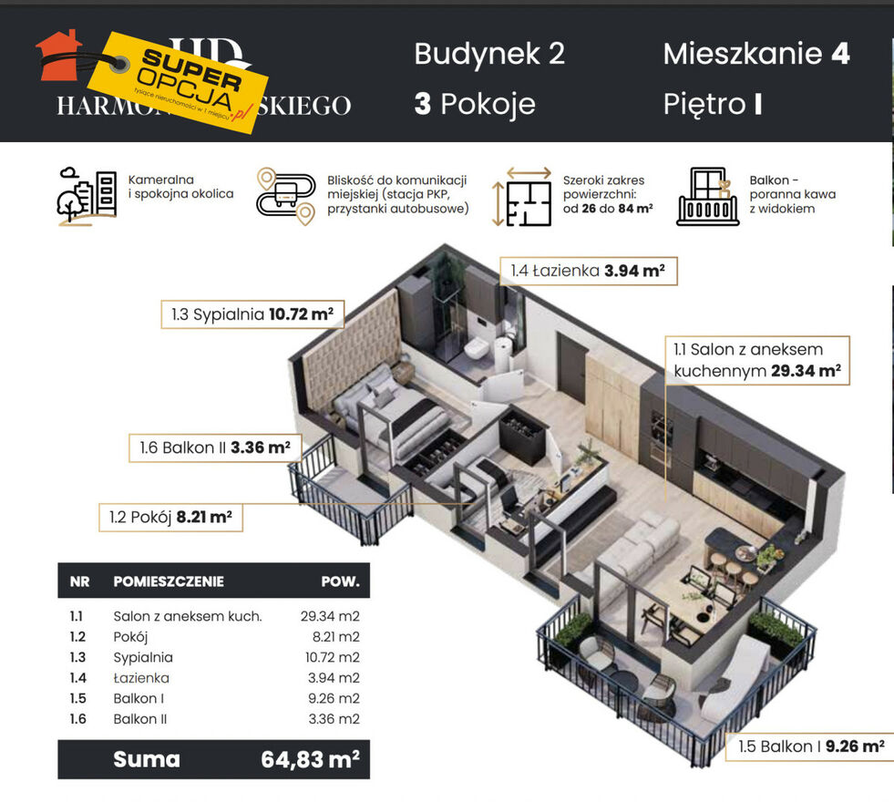 Nowoczesne, 3-pokojowe mieszkanie położone na1 piętrze w inwestycji Harmonia Dębskiego. Doskonały układ pomieszczeń. 2 balkony to dodatkowa przestrzeń do wypoczynku. Idealne dla rodzin lub par szukających komfortu w spokojnej, zielonej okolicy z dobrym dojazdem do centrum.Mieszkanie: