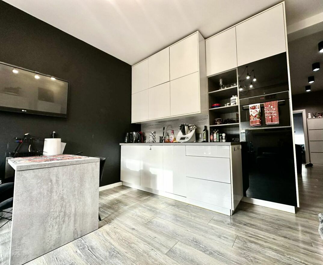 Salon z aneksem kuchennym: sofa, stół z krzesłami, telewizor, kompletne wyposażenie kuchni (meble, sprzęt AGD).