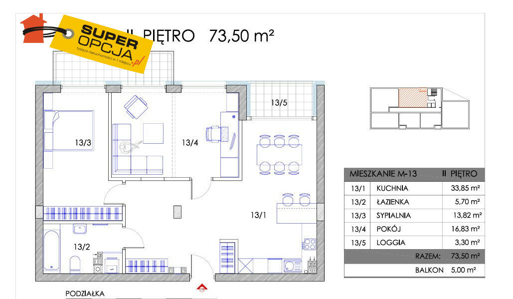dwie sypialnie (z możliwością wydzielenia trzeciej - np. gabinetu lub pokoju dziecięcego),