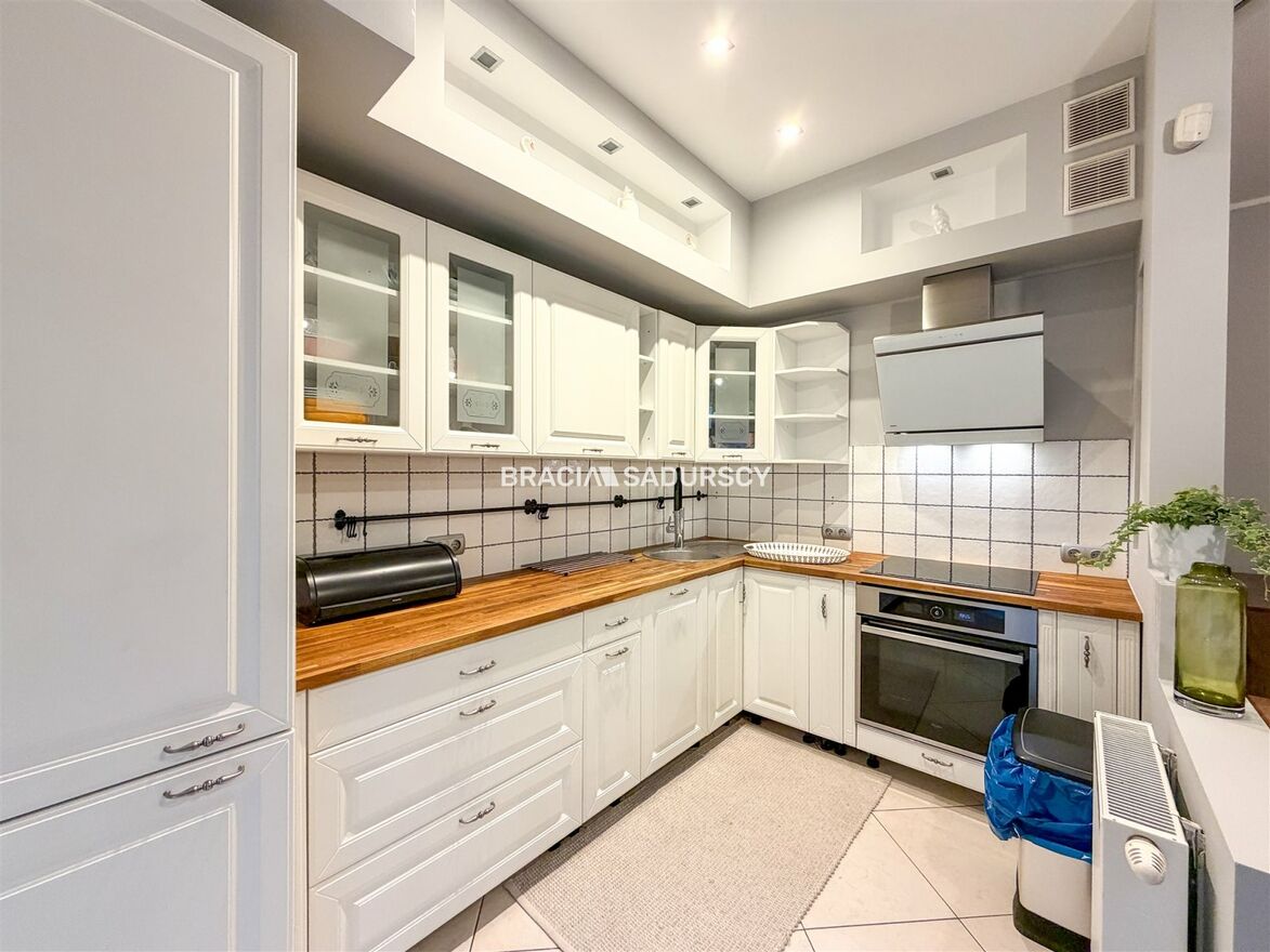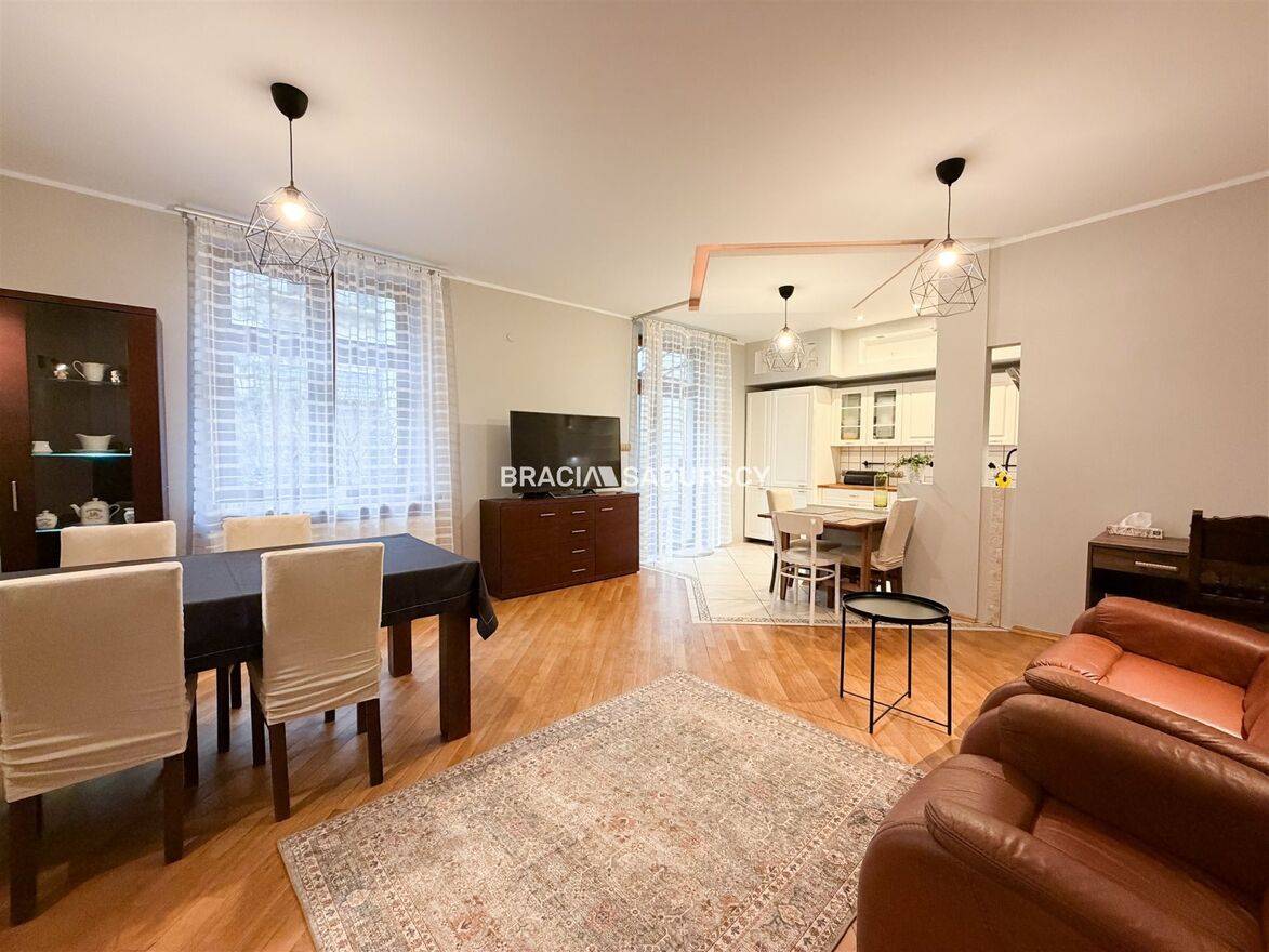 Mieszkanie jest świeżo po remoncie i zostało przygotowane z myślą o wygodnym najmie długoterminowym. W salonie znajduje się część wypoczynkowa z wyjściem na taras i ogród. Aneks kuchenny wyposażony jest w nowe sprzęty AGD, w tym lodówkę, zmywarkę, płytę indukcyjną oraz piekarnik.