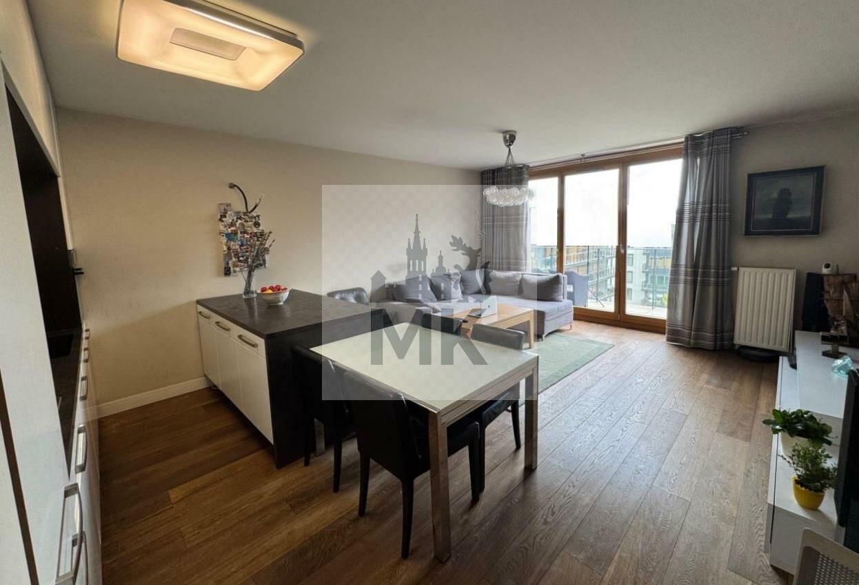 przestronny salon z aneksem kuchennym i wyjściem na balkon,