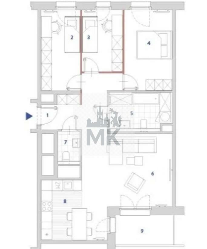 układ: salon z otwartą kuchnią, 3 sypialnie, łazienka z WC, garderoba (zaaranżowana z oddzielnego WC), przedpokój, loggia