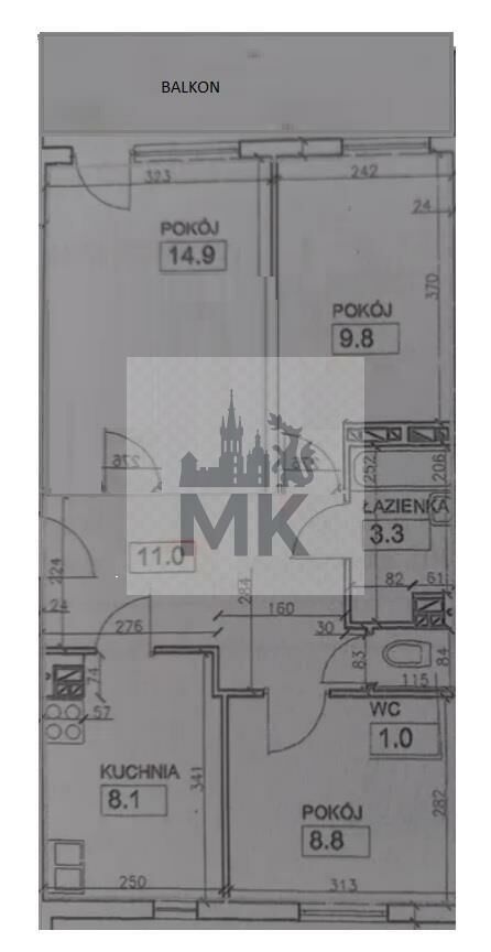 układ: 3 pokoje, kuchnia, łazienka, oddzielne WC, przedpokój, duży balkon