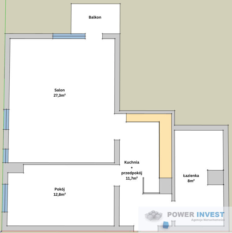 Salon (27,3 m²) – przestronny i słoneczny, wyposażony w zabudowę
