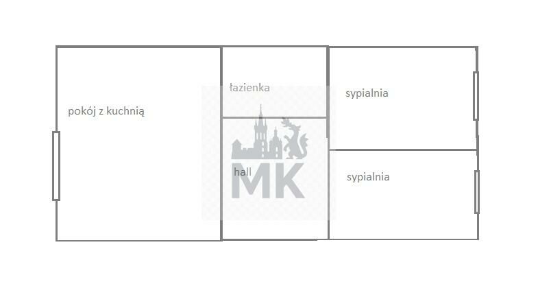 Układ pomieszczeń, który można uzyskać po remoncie (obecnie: 2 pokoje, kuchnia, łazienka z WC):