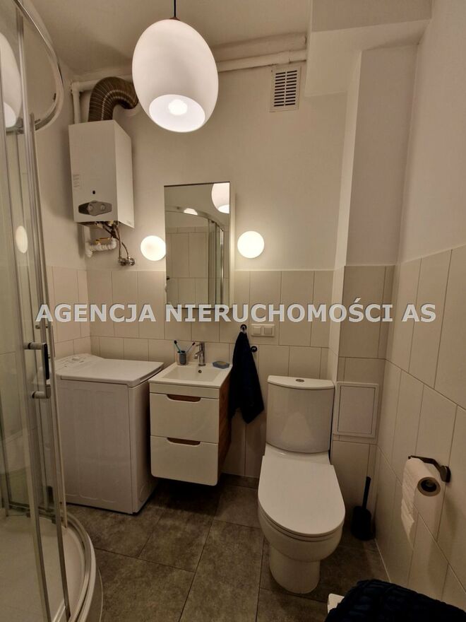 Łazienka wykończona została nowoczesną armaturą, z kabiną prysznicową z baterią termostatyczną, szafką z lustrem oraz szufladami pod umywalką. W łazience znajduje się pralka marki Whirlpool.
