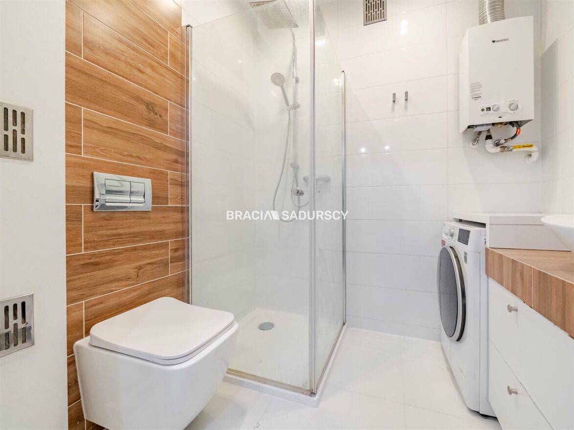 łazienki wyposażonej w prysznic, toaletę, umywalkę oraz pralkę.
