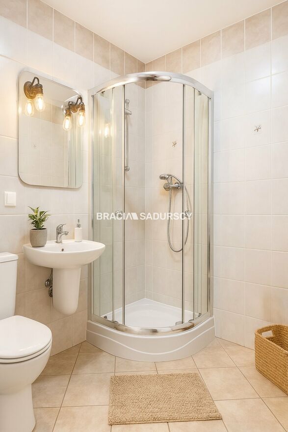 Wyposażenie łazienki: umywalka, lustro, kabina prysznicowa |
