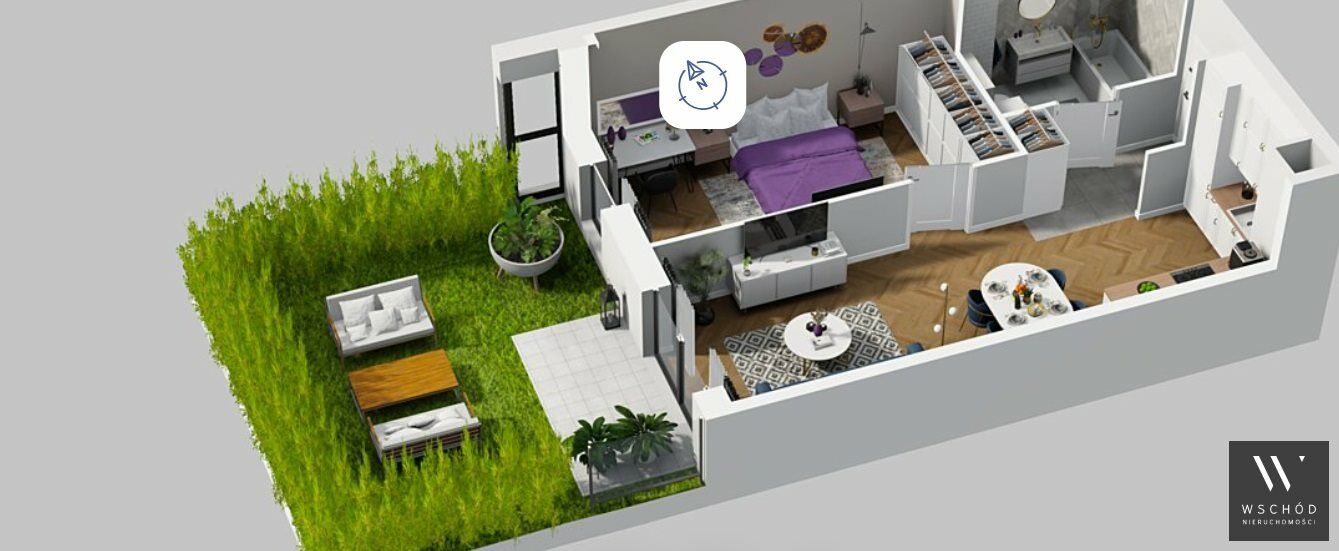 Mieszkanie składające się z salonu z aneksem kuchennym , sypialni, łazienki oraz ogródka