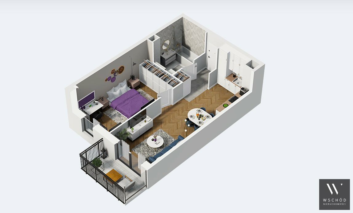 Mieszkanie składające się z salonu z aneksem kuchennym , sypialni, łazienki oraz balkonu.