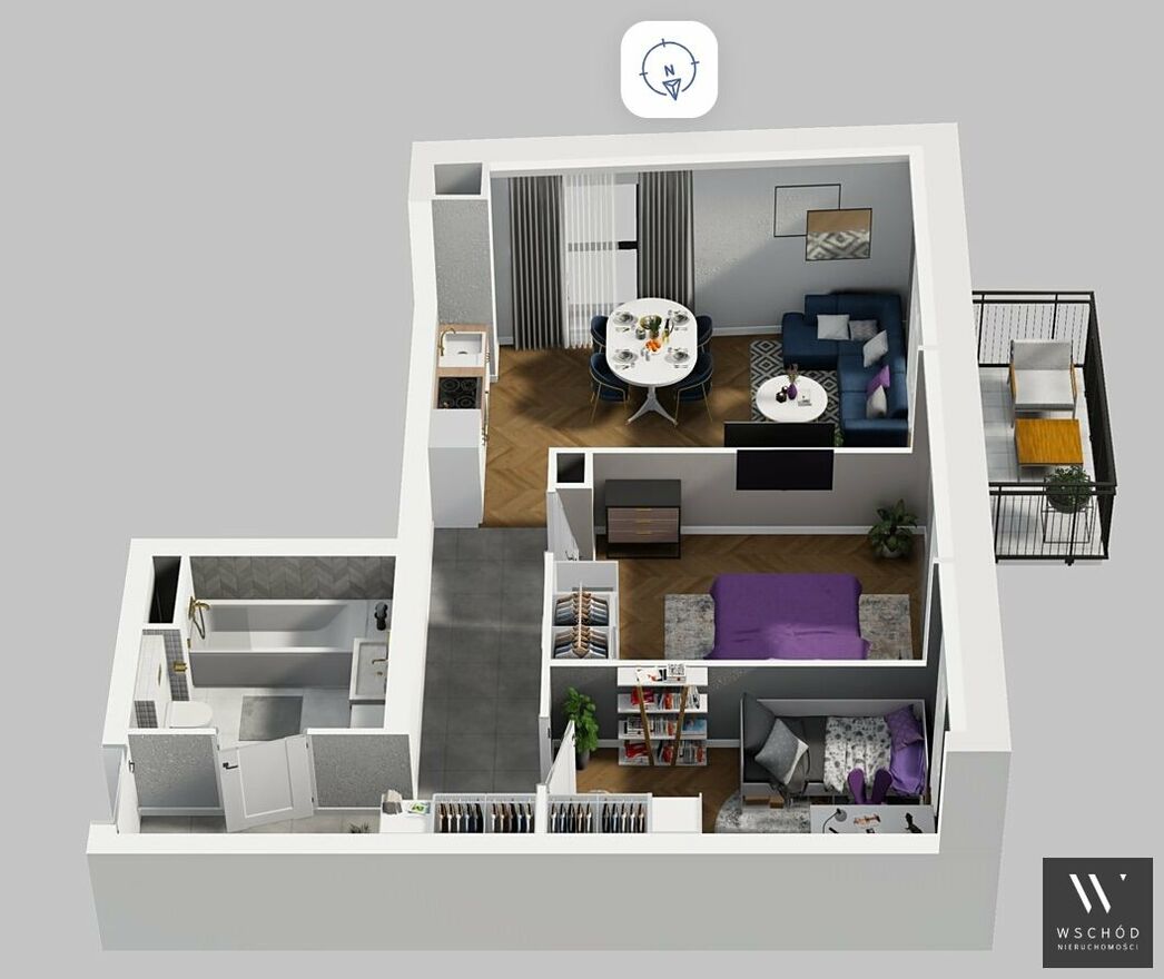 Mieszkanie składające się z pokoju z aneksem kuchennym , dwóch sypialni, łazienki oraz balkonu.