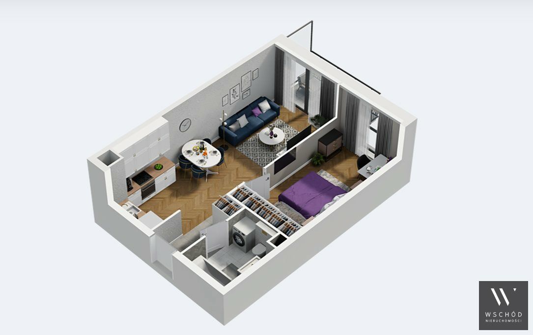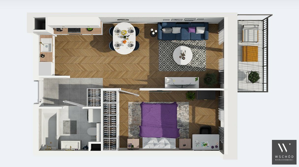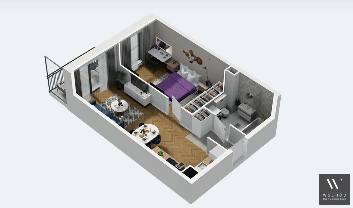 Mieszkanie składające się z salonu z aneksem kuchennym , sypialni, łazienki oraz balkonu.