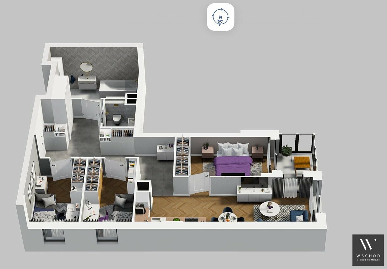 Mieszkanie składające się z salonu z aneksem kuchennym , trzech sypialni, łazienki , WC oraz balkonu.