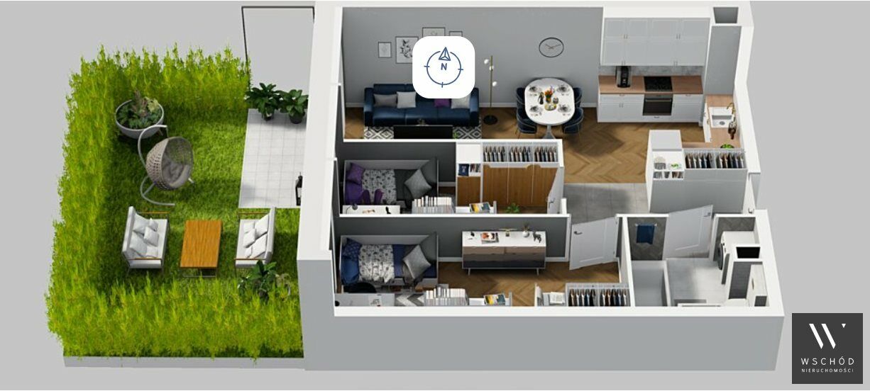 Mieszkanie składające się z salonu z aneksem kuchennym , dwóch sypialni, przedpokoju, łazienki oraz ogródka.