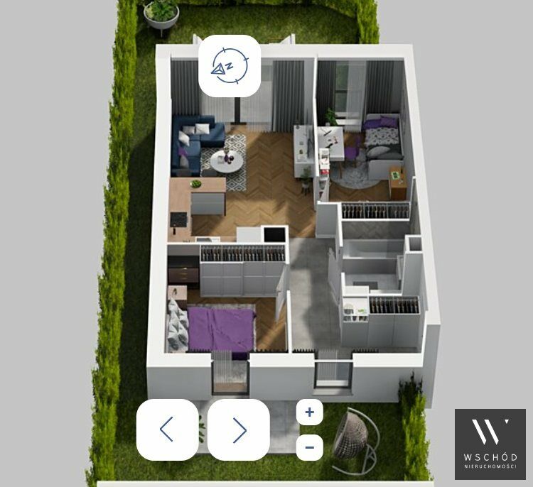 Mieszkanie składające się z salonu z aneksem kuchennym, dwóch sypialni, przedpokoju, łazienki, ogródka