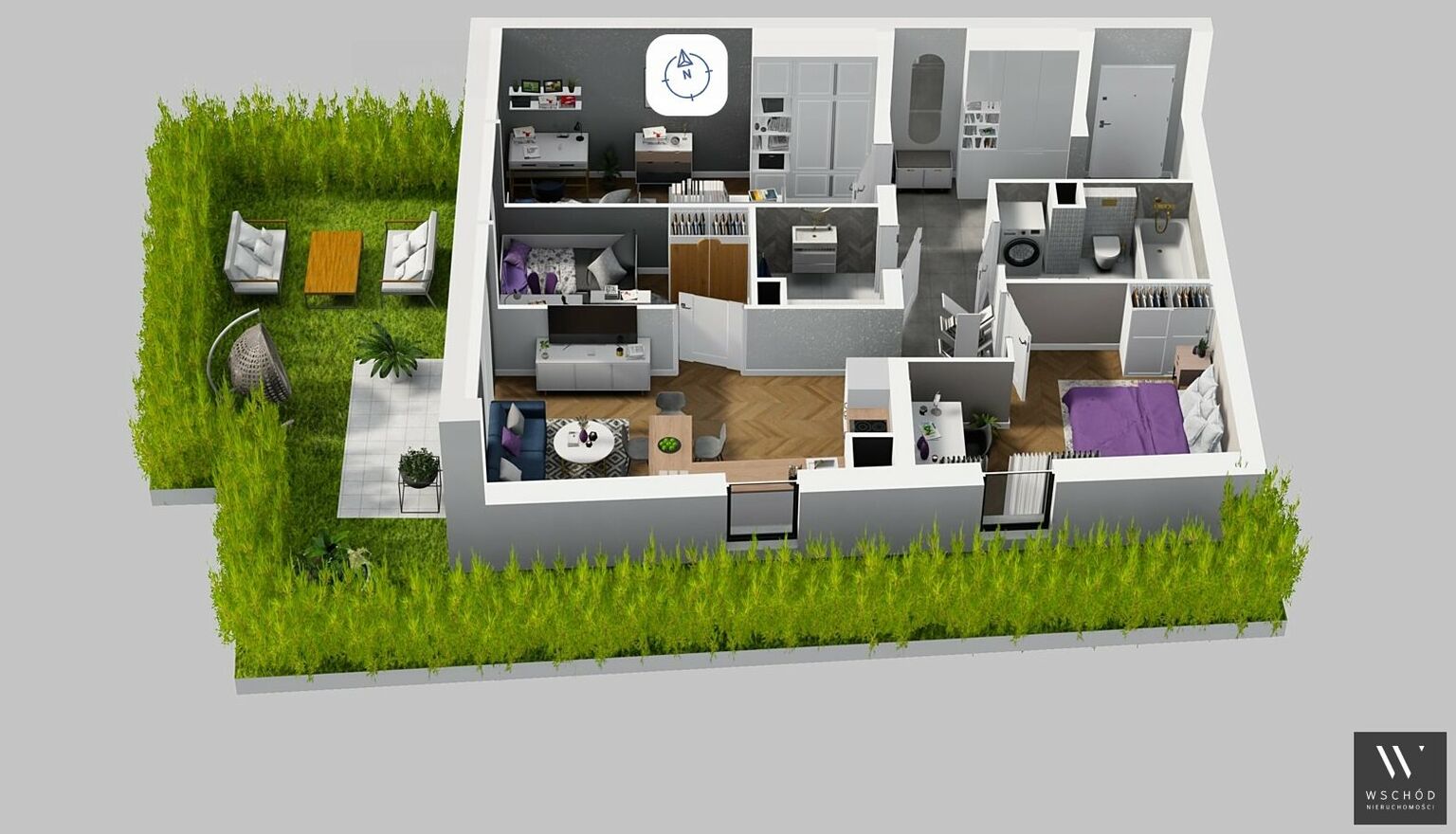 Mieszkanie składające się z salonu z aneksem kuchennym , trzech sypialni, przedpokoju, dwóch łazienek oraz ogródka o pow. 35m2