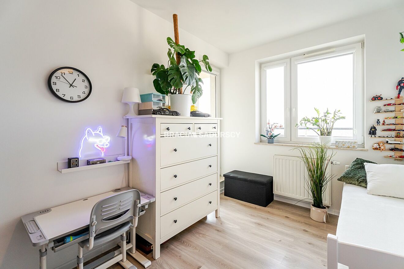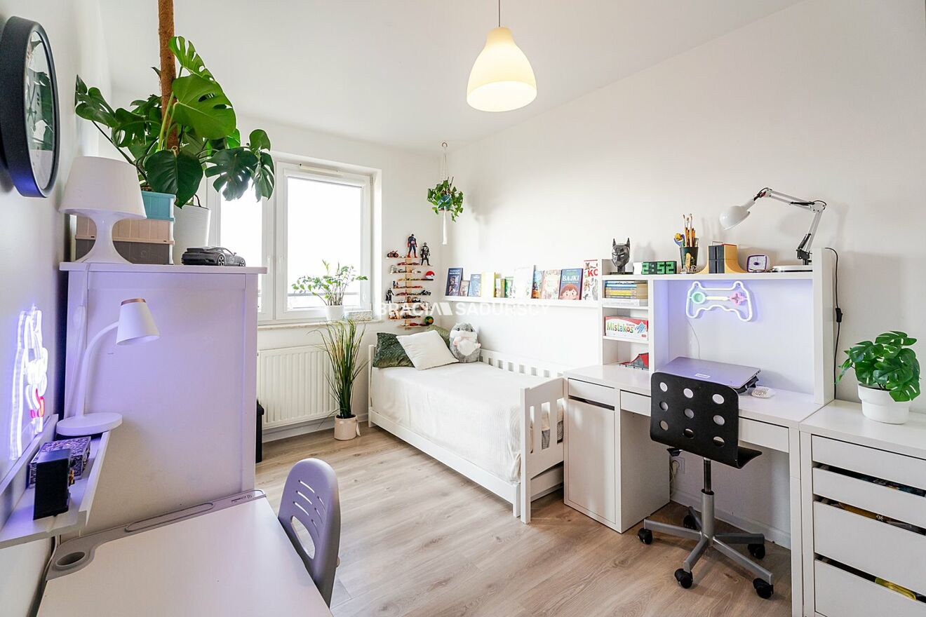 - sypialnia (ok. 11,5m2) - obecnie zaaranżowana jako gustowny pokój dziecięcy, o wygodnym i przemyślanym układzie, pozwalającym w przyszłości łatwo zmienić funkcję tego pomieszczenia. Z sypialni prowadzi wyjście na balkon (niecałe 4m2)
