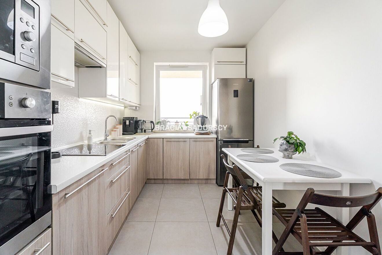 Wyposażenie kuchni: stała zabudowa, zmywarka, zlewozmywak z baterią, zamrażarka, zabudowa kuchenna, sprzęt AGD, płyta indukcyjna, piekarnik elektryczny, piekarnik, okap, lodówka, kuchenka, krzesła |