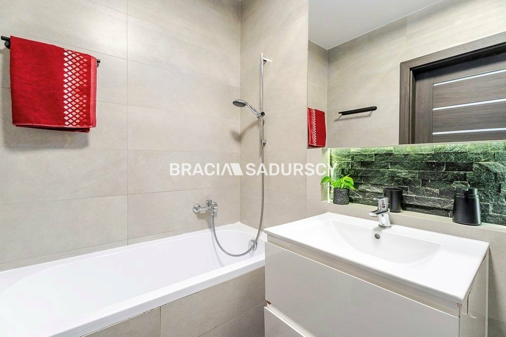 - łazienka (ok. 4,2m2) - zaprojektowana przez architekta, łącząca funkcjonalność z oryginalnym designem. Wyposażona w wannę, pralkę oraz toaletę.