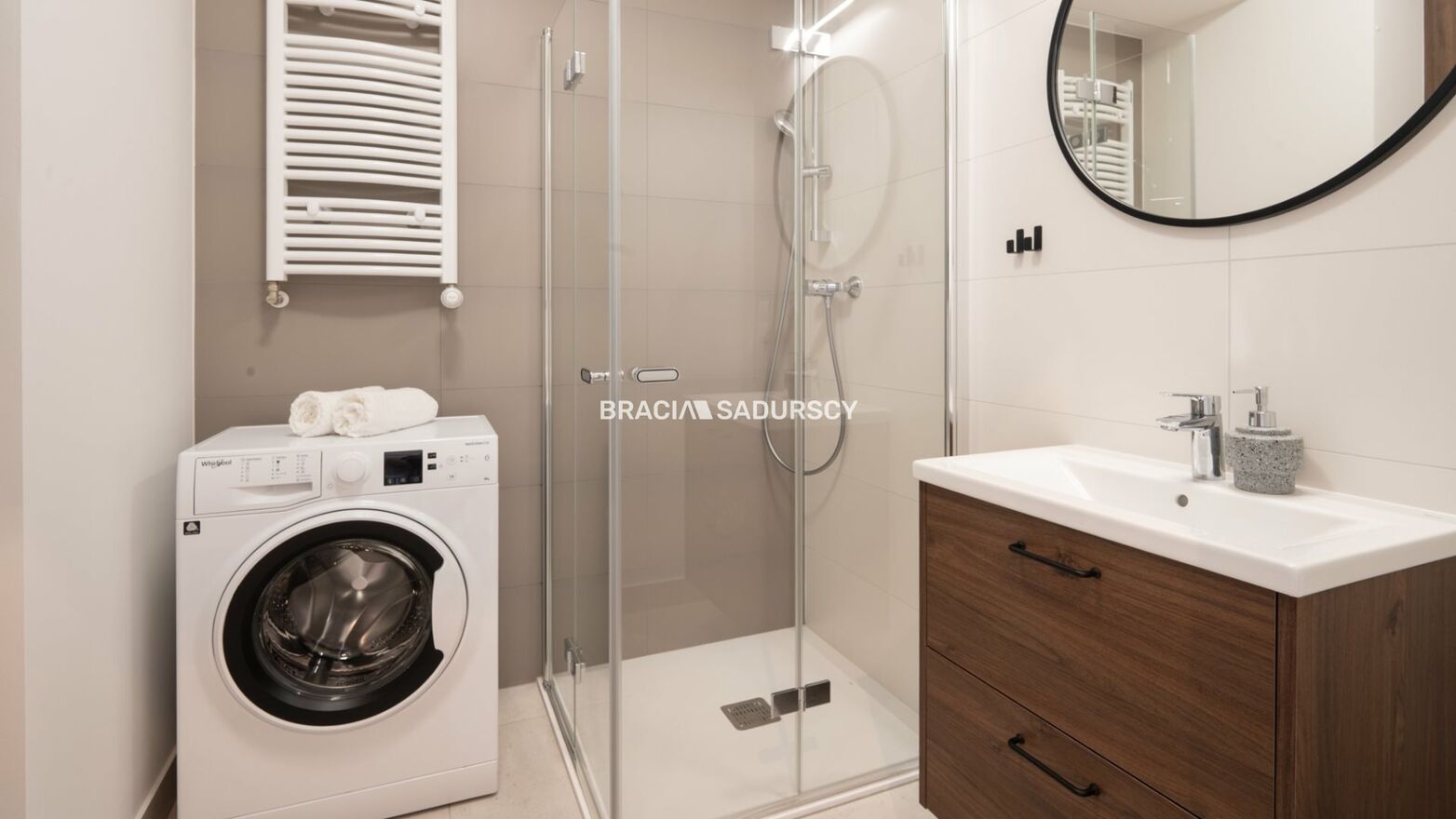 Łazienka : kabina prysznicowa, pralka, szafki na kosmetyki i środki czystości.