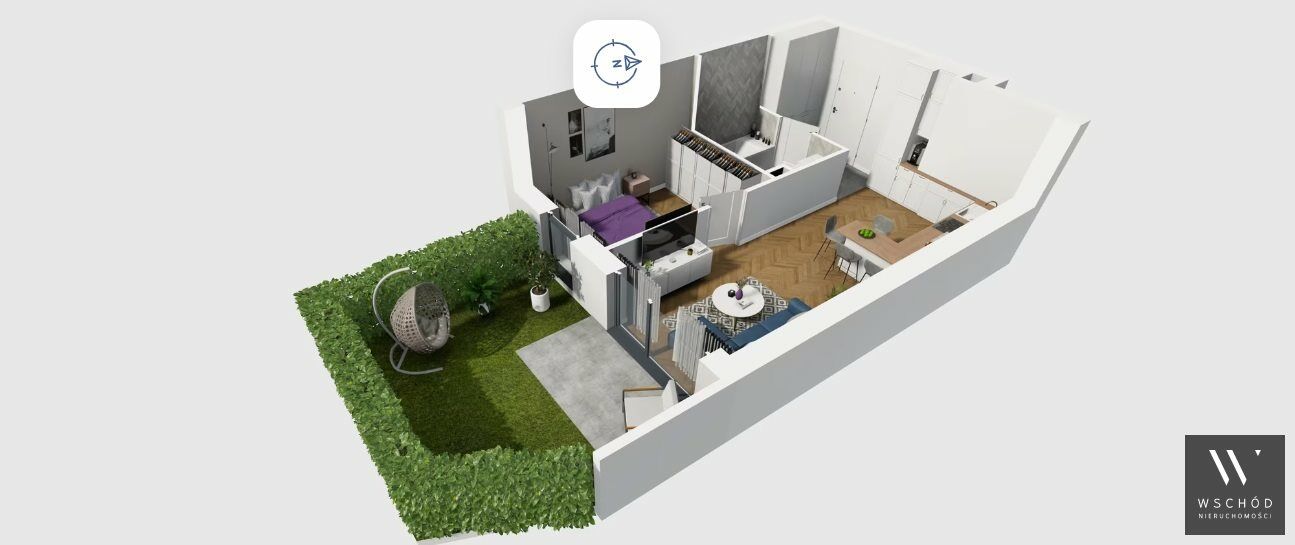 Mieszkanie składające się z salonu z aneksem kuchennym, sypialni, przedpokoju, łazienki oraz ogródka o pow. 11m2