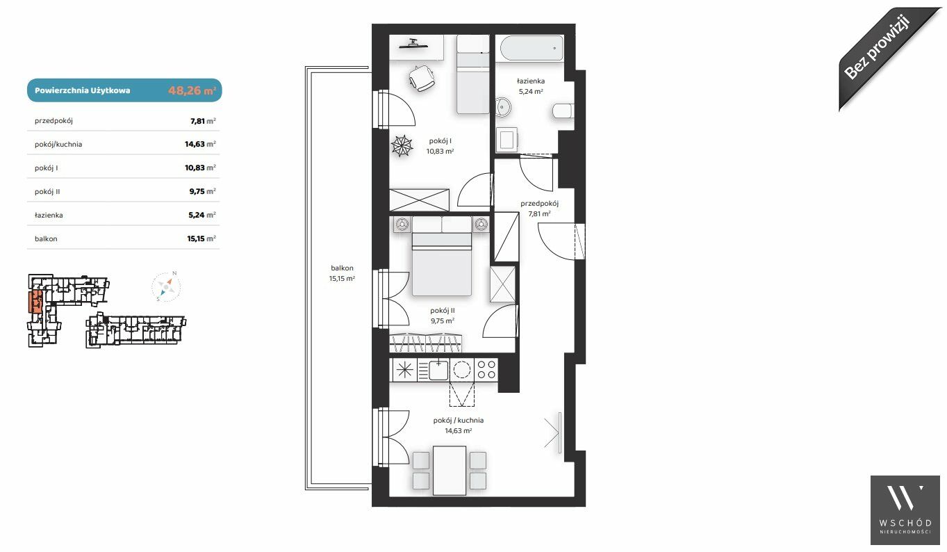 Mieszkanie składające się z salonu z aneksem kuchennym, dwóch sypialni, przedpokoju, łazienki oraz balkonu o pow. 15m2