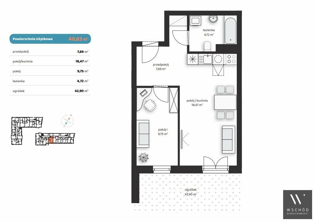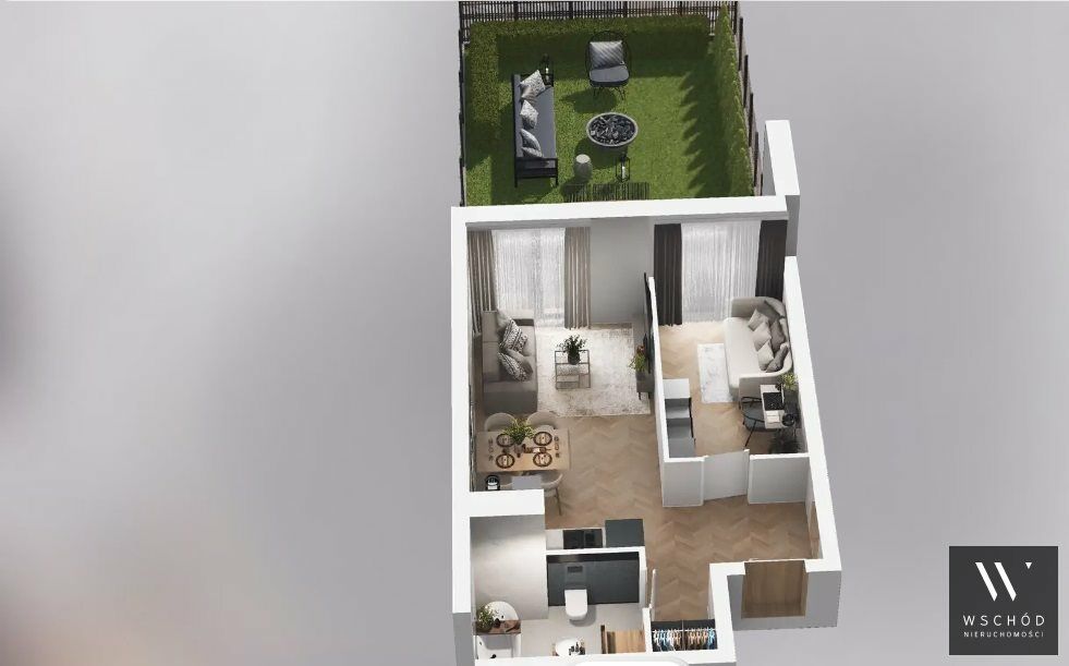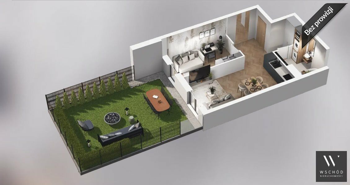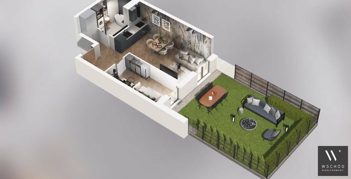 Mieszkanie składające się z salonu z aneksem kuchennym, sypialni, przedpokoju, łazienki oraz ogródka o pow. 42 m2