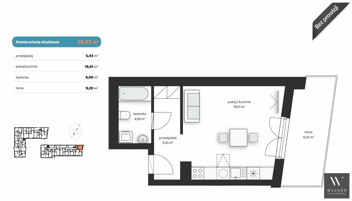 Mieszkanie składające się z pokoju z aneksem kuchennym, przedpokoju, łazienki oraz balkonu