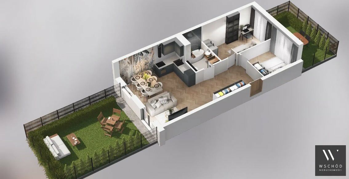 Mieszkanie składające się z salonu z aneksem kuchennym, dwóch sypialni, przedpokoju, łazienki oraz ogródka