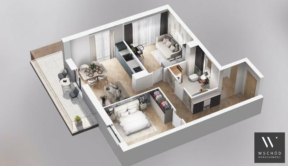 Mieszkanie składające się z salonu z aneksem kuchennym, dwóch sypialni, przedpokoju, łazienki oraz balkonu o pow. 15m2