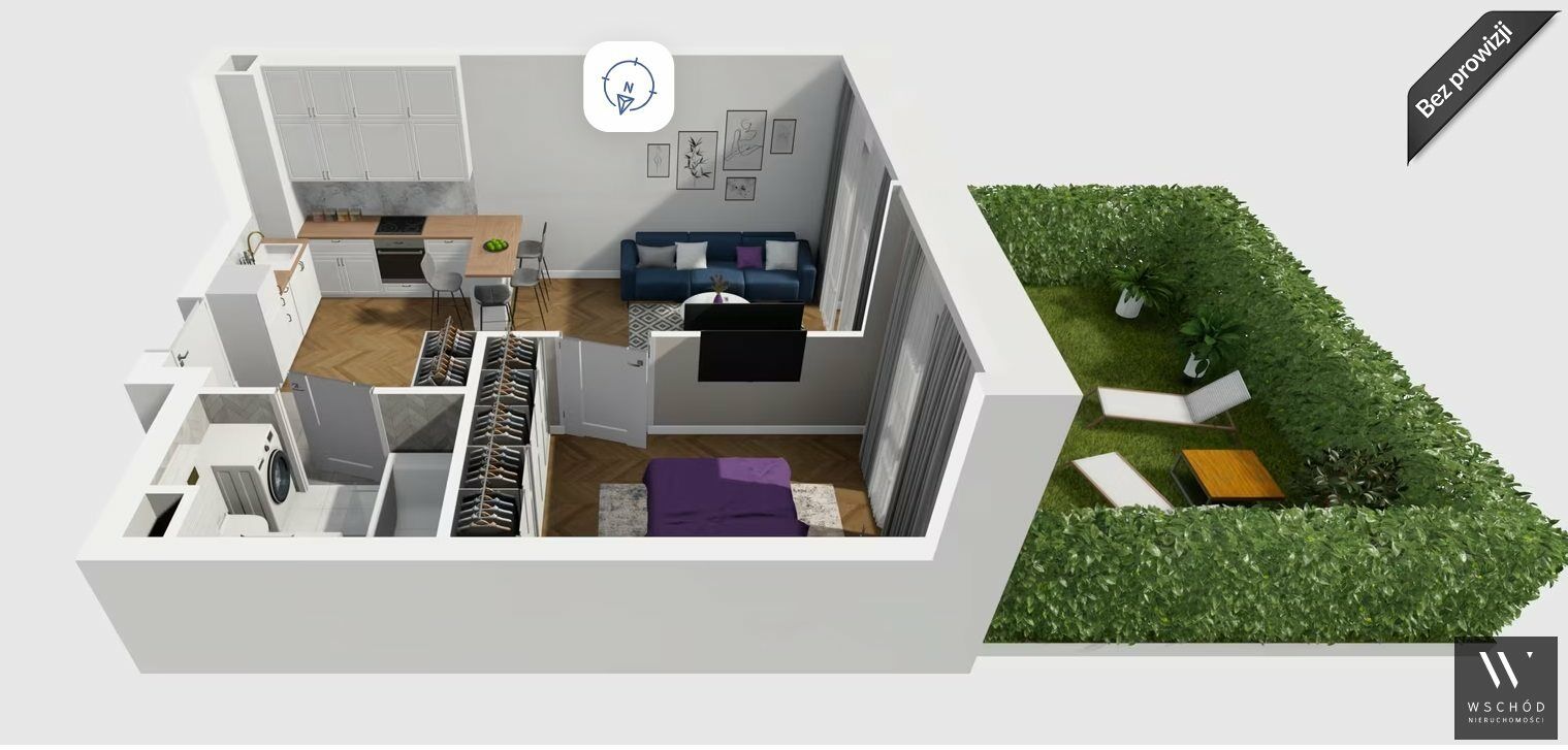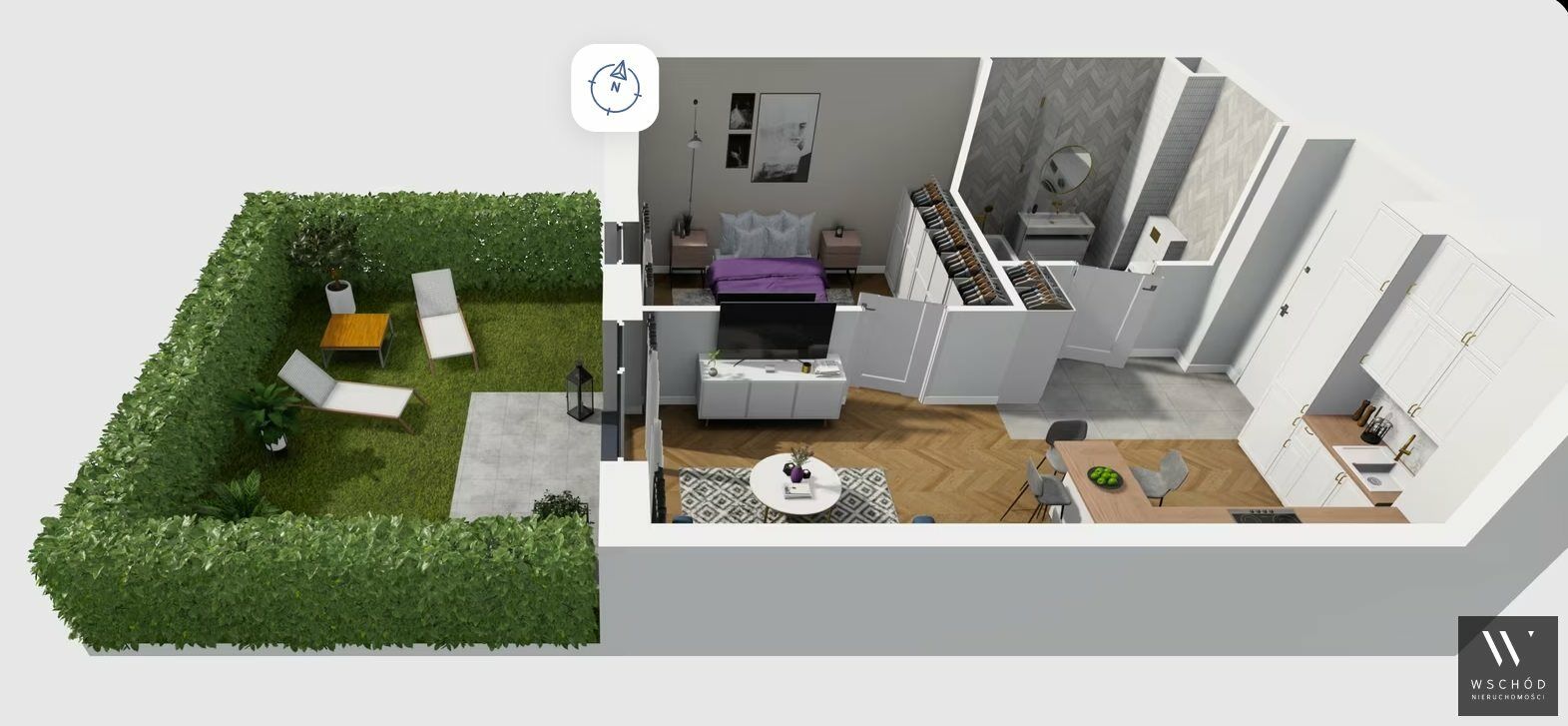 Mieszkanie składające się z salonu z aneksem kuchennym , sypialni, przedpokoju, łazienki oraz ogródka