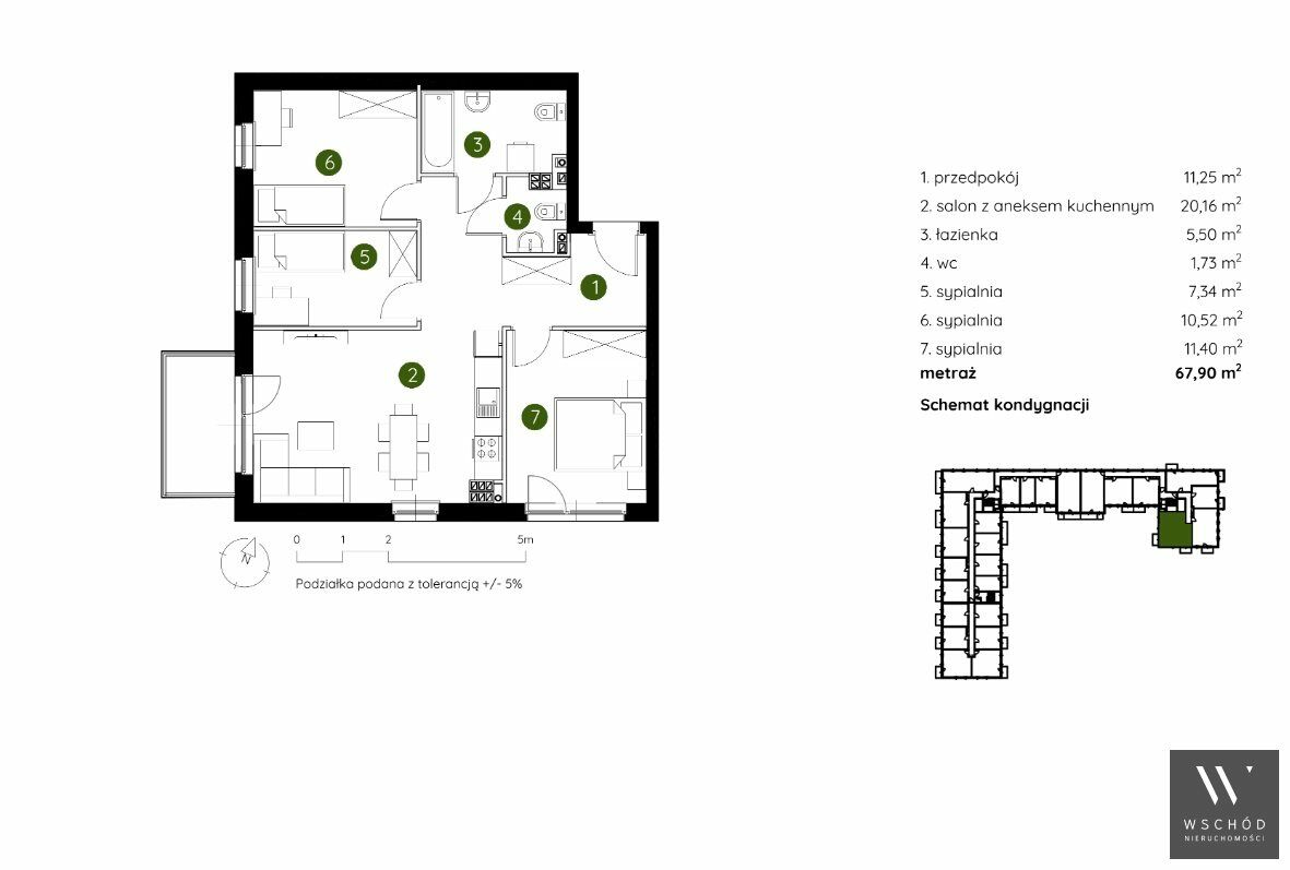 Mieszkanie składające się z salonu z aneksem kuchennym , trzech sypialni, przedpokoju, łazienki, WC oraz balkonu