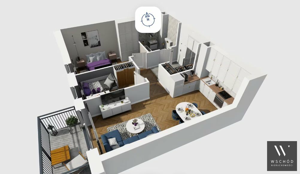 Mieszkanie składające się z salonu z aneksem kuchennym , dwóch sypialni, przedpokoju, łazienki, oraz balkonu