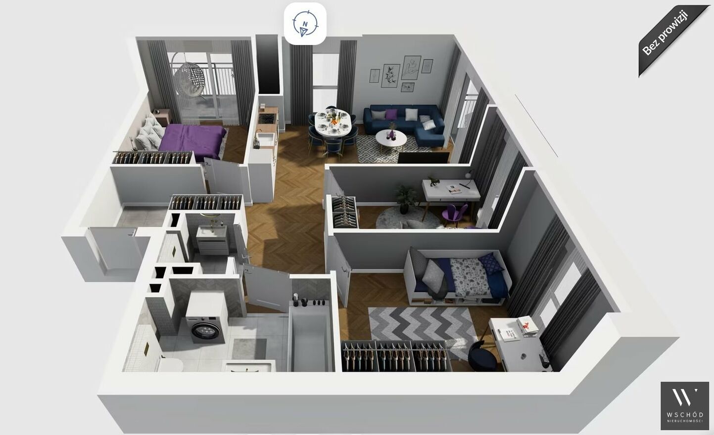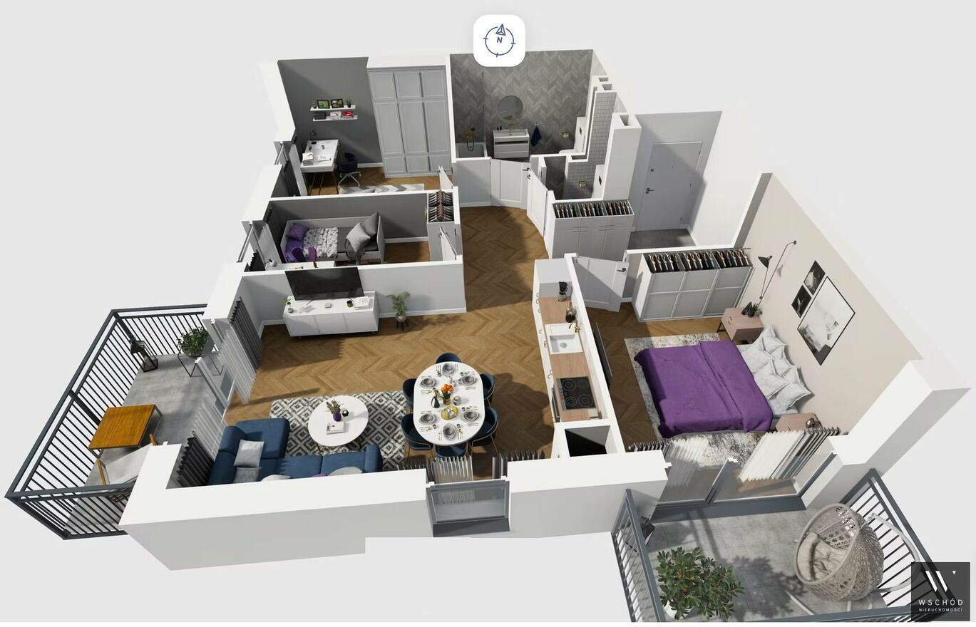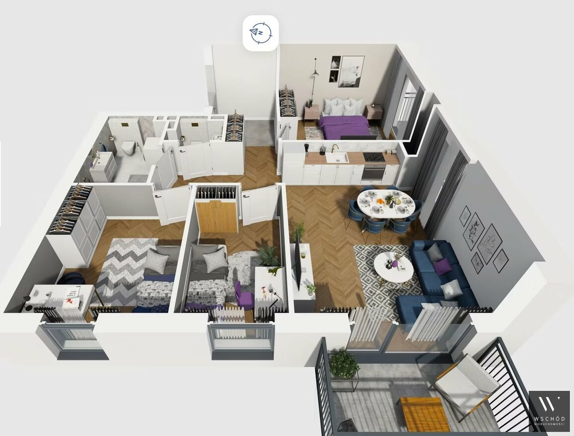 Mieszkanie składające się z salonu z aneksem kuchennym , trzech sypialni, przedpokoju, łazienki, WC oraz balkonu