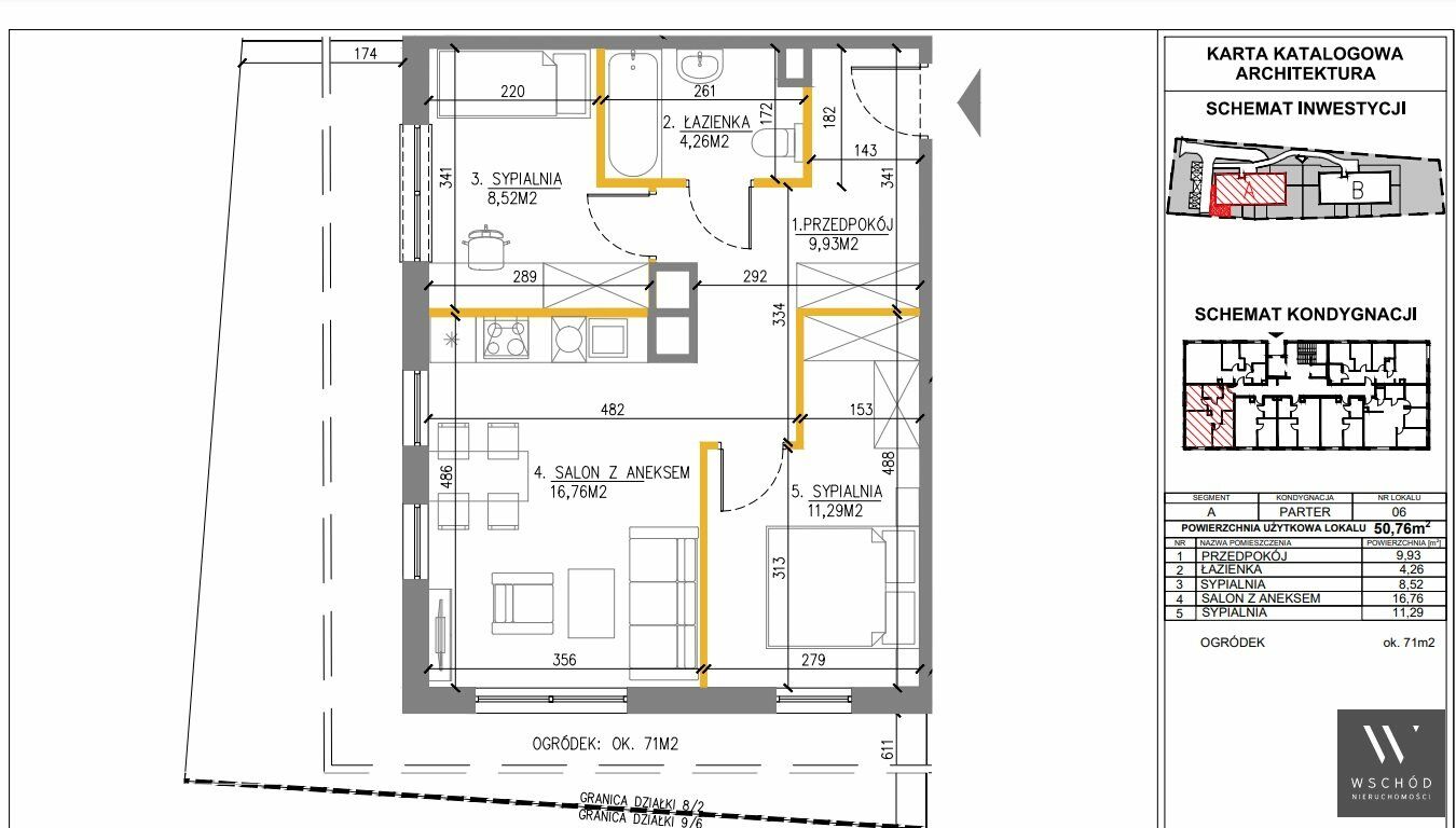Mieszkanie składające się z salonu z aneksem kuchennym, dwóch sypialni, przedpokoju, łazienki oraz narożnego ogródka o pow. 71m2