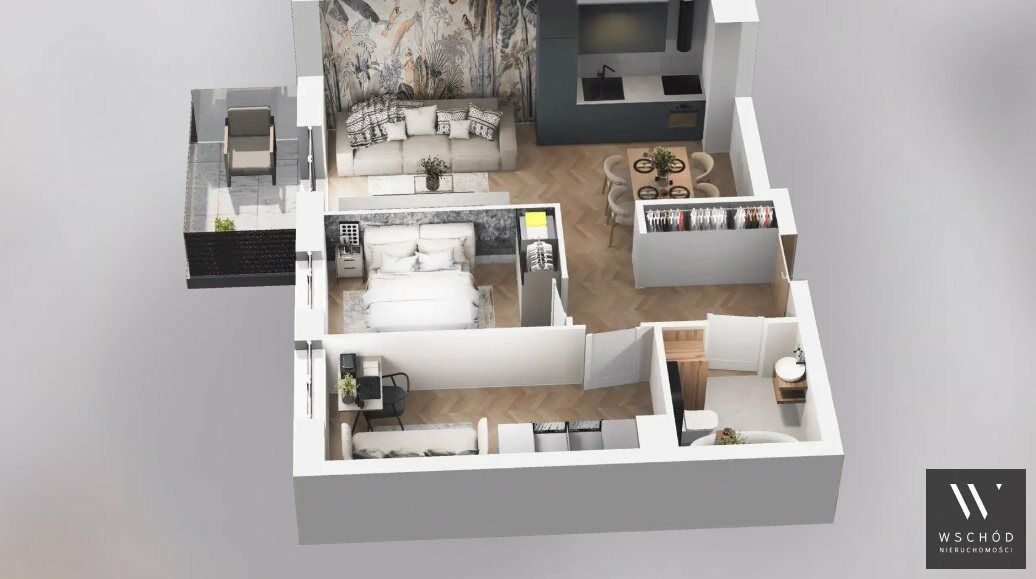 Mieszkanie składające się z salonu z aneksem kuchennym, dwóch sypialni, przedpokoju, łazienki oraz balkonu