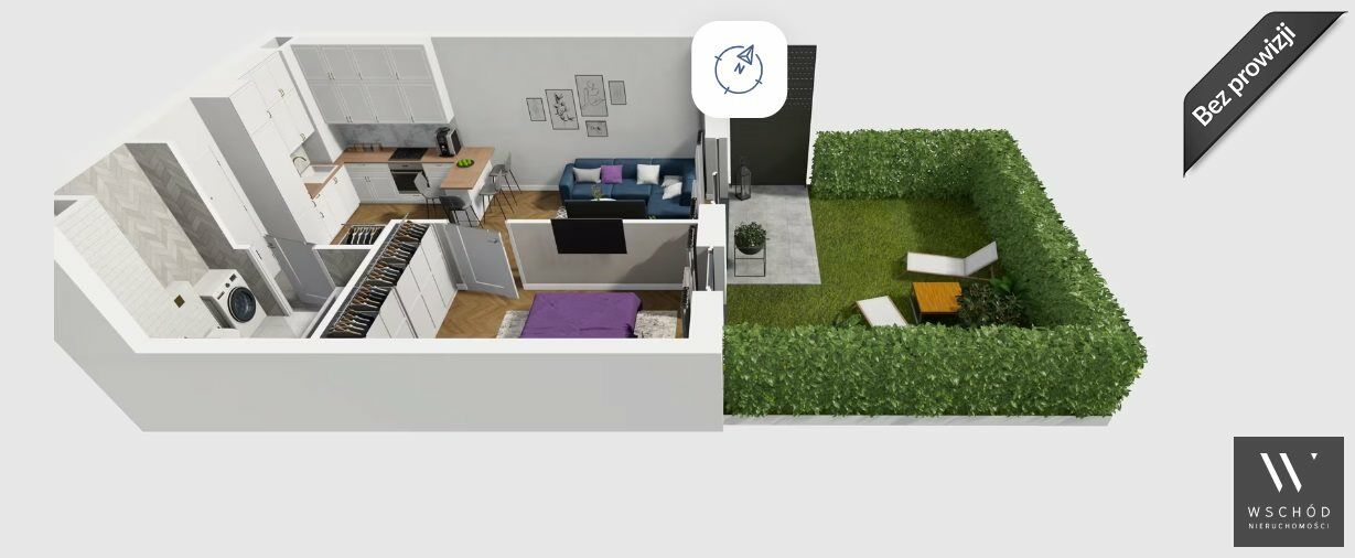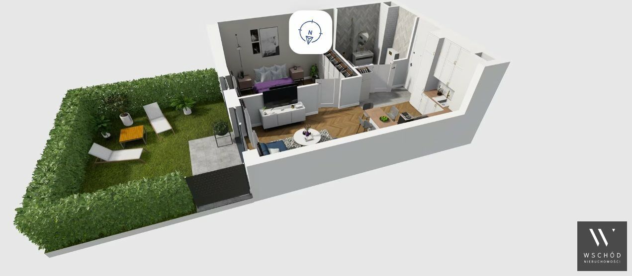 Mieszkanie składające się z salonu z aneksem kuchennym , sypialni, przedpokoju, łazienki oraz ogródka