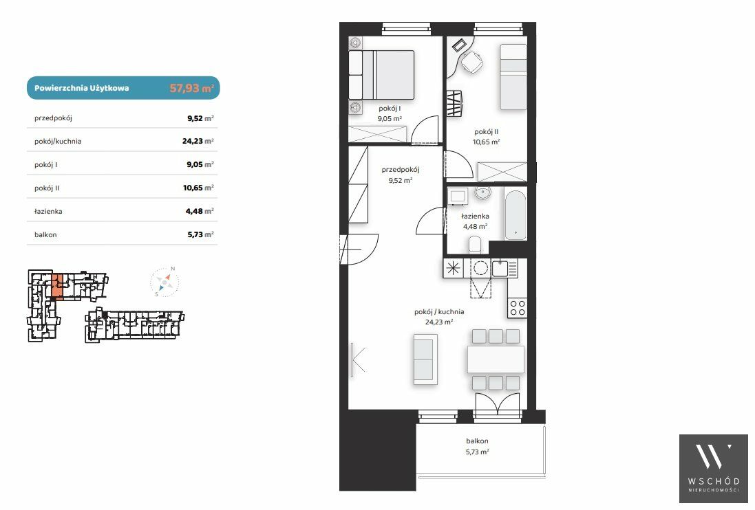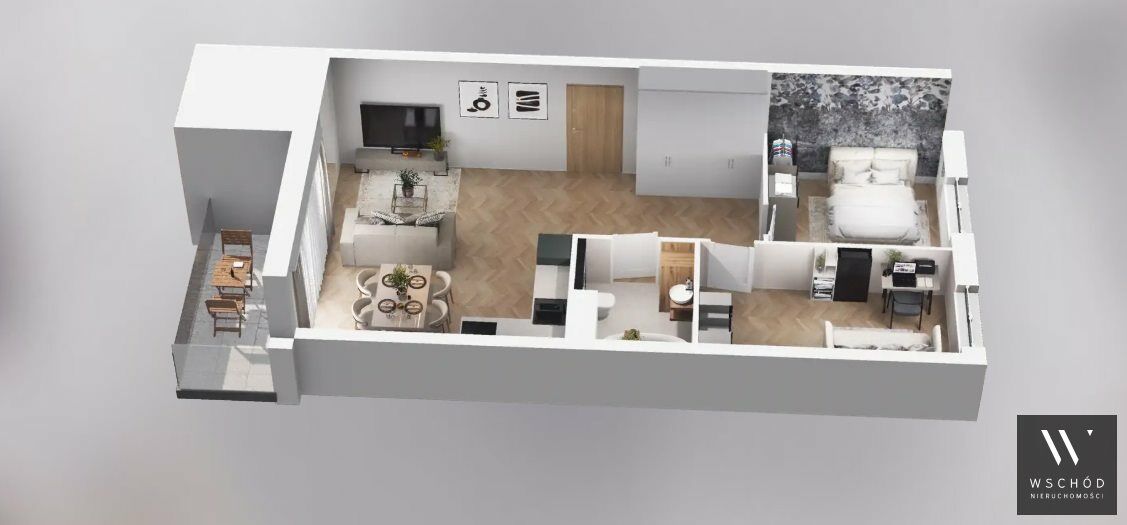Mieszkanie składające się z salonu z aneksem kuchennym, dwóch sypialni, przedpokoju, łazienki oraz balkonu
