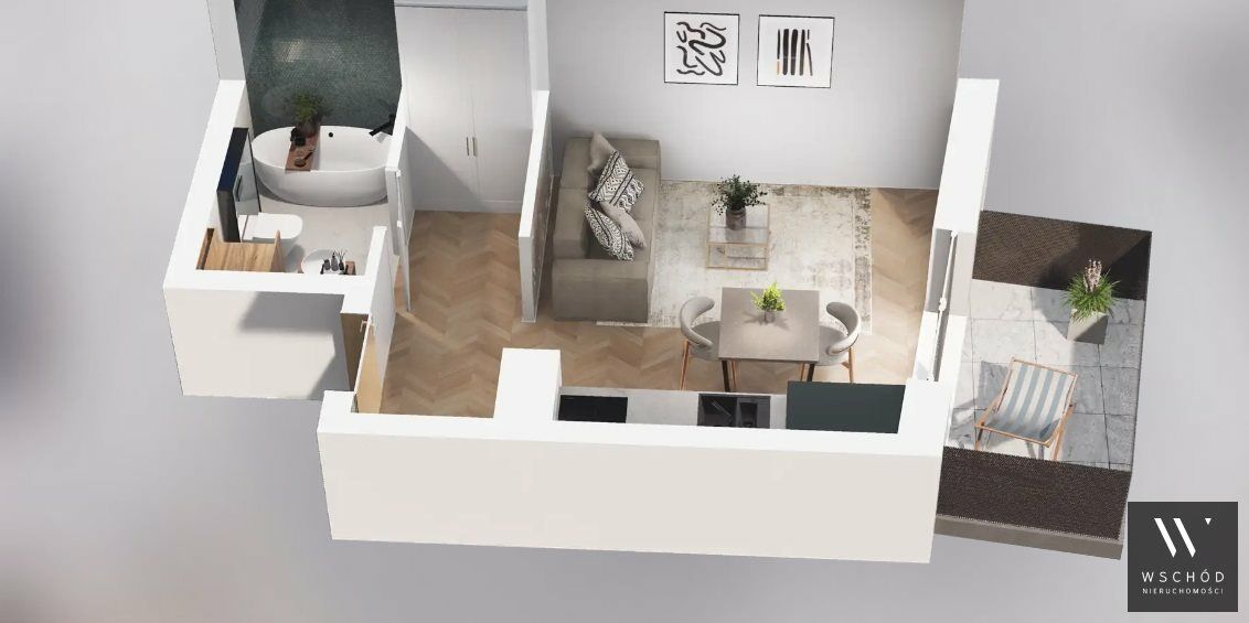 Mieszkanie składające się z pokoju z aneksem kuchennym, przedpokoju, łazienki oraz balkonu