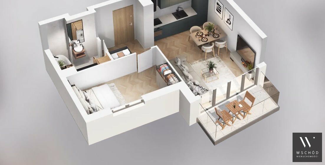 Mieszkanie składające się z salonu z aneksem kuchennym, sypialni, przedpokoju, łazienki oraz balkonu