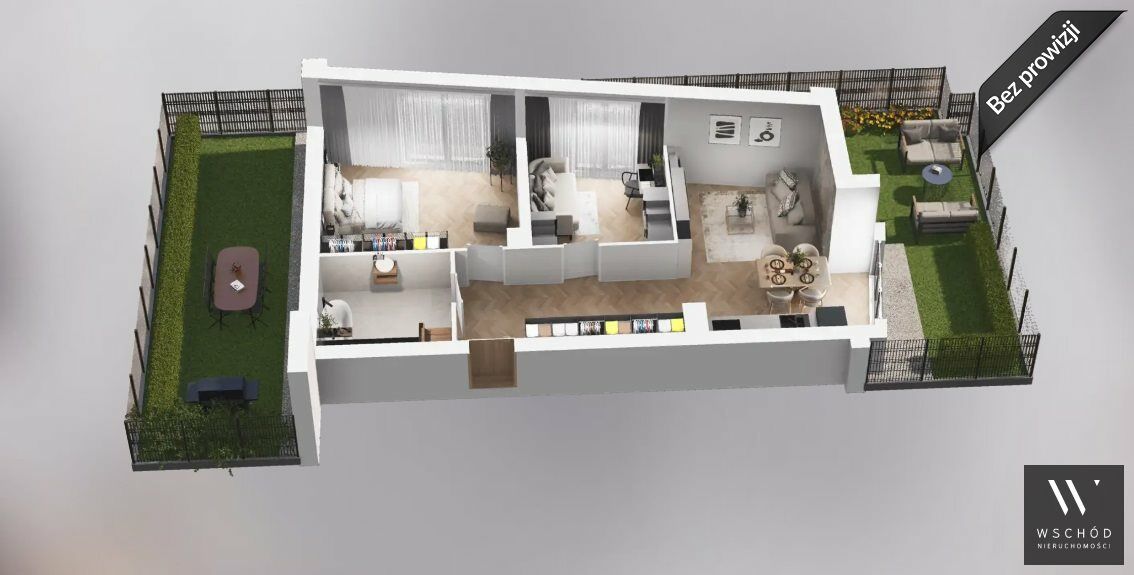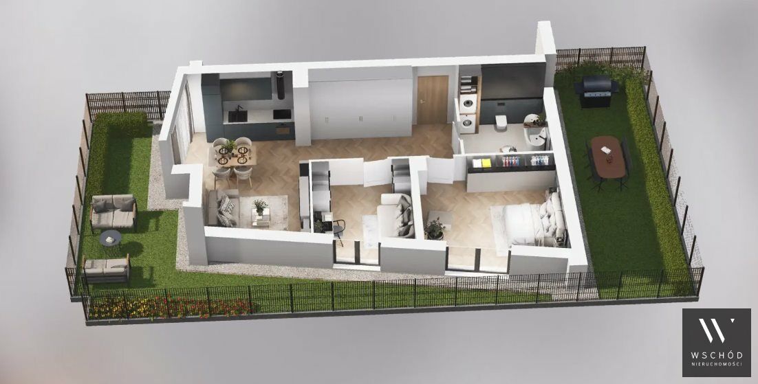 Mieszkanie składające się z salonu z aneksem kuchennym, dwóch sypialni, przedpokoju, łazienki oraz ogródka z tarasem o pow. ok 70m2