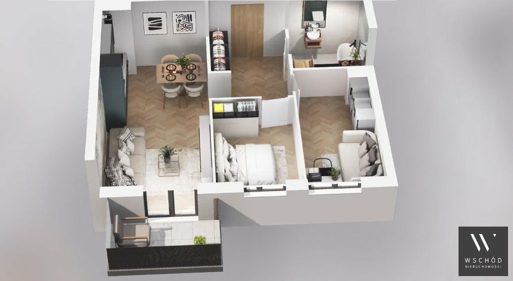 Mieszkanie składające się z salonu z aneksem kuchennym, dwóch sypialni, przedpokoju, łazienki oraz balkonu